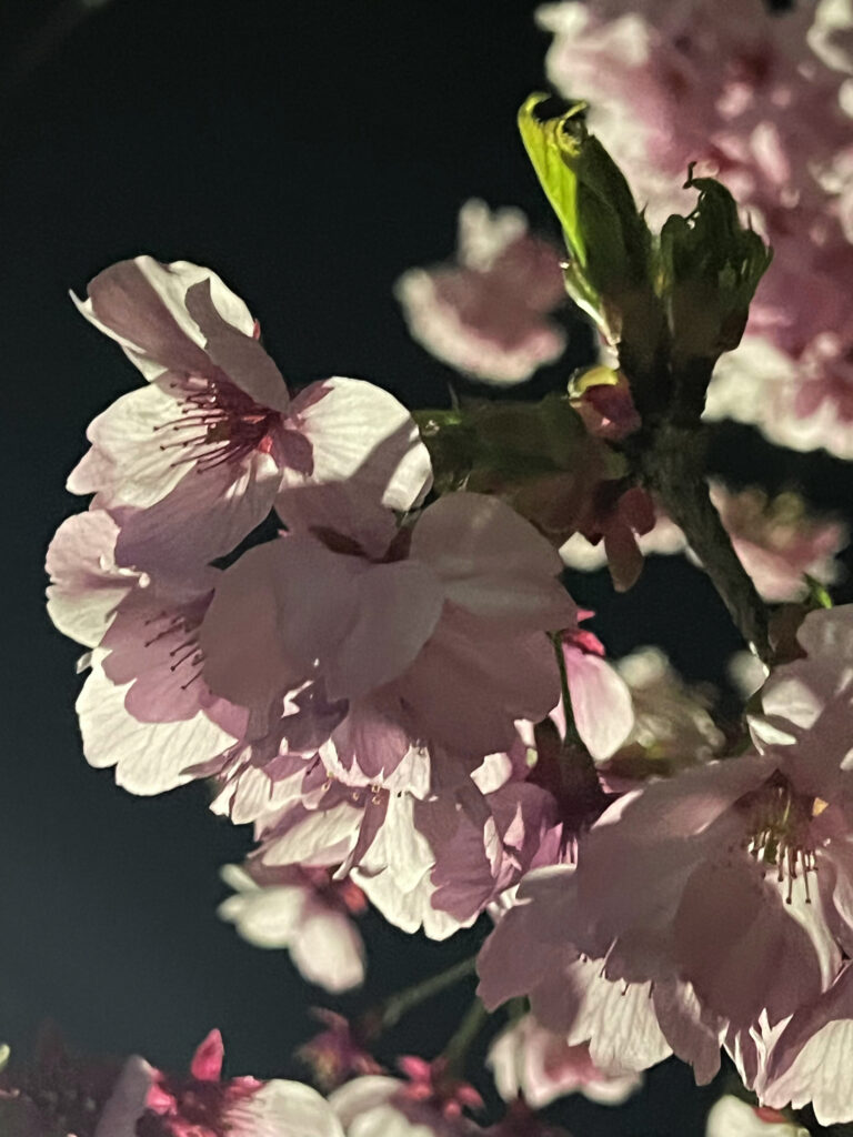 1枚目は、夜の散歩で立ち寄った近所の公園に咲いていた桜です。街灯に照らされて透ける花びらと、その影のコントラストが印象的だったので、思わずスマホで撮影しました。