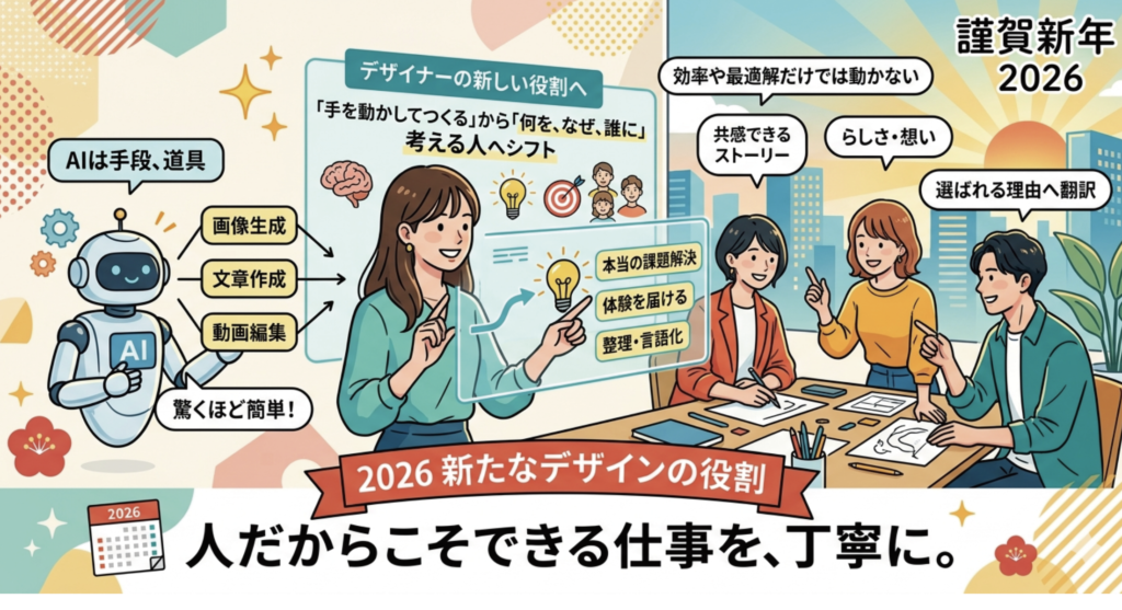 今年は、デザインという仕事の立ち位置が、これまで以上に問われる一年になると感じています。この数年で、AIは一気に「特別な技術」から「誰もが使える道具」へと変わりました。画像生成、文章作成、動画編集――かつては専門スキルが必要だった作業が、今では数分で形になる時代です。デザインの現場でも、AIを使えば「それっぽいもの」をつくること自体は、驚くほど簡単になりました。