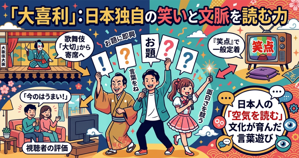 そして忘れてはならないのが、視聴者側の存在です。日本人は長年にわたり、お笑い番組を日常的に見続けてきました。高度成長期以降、家庭の居間にはテレビがあり、漫才ブーム、バラエティ全盛期、深夜番組文化などを通じて、視聴者は自然と「この返しは弱い」「今のは一段うまい」と評価する感覚を身につけてきたのだと思います。『笑点』がこれほど長寿番組として愛されているのも、日本人の大喜利理解度の高さを示しているのではないでしょうか。